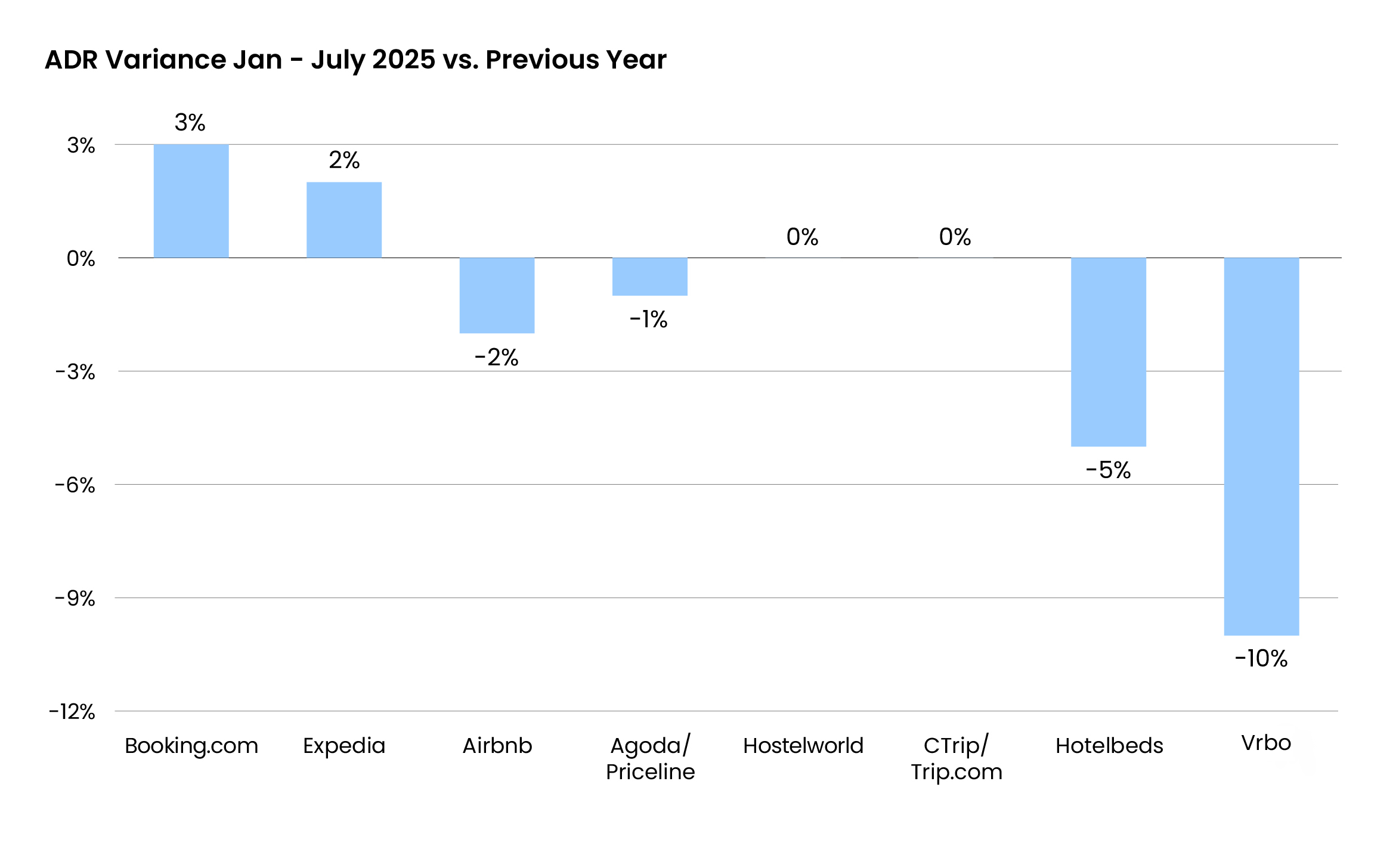 After years of strong rate growth, travelers are becoming more price-sensitive, particularly in the economy and midscale segments. Across our data set, average daily rates (ADR) rose modestly on Expedia and Booking.com bookings but dropped 10% on Vrbo, 5% on Hotelbeds, and 2% on Airbnb.