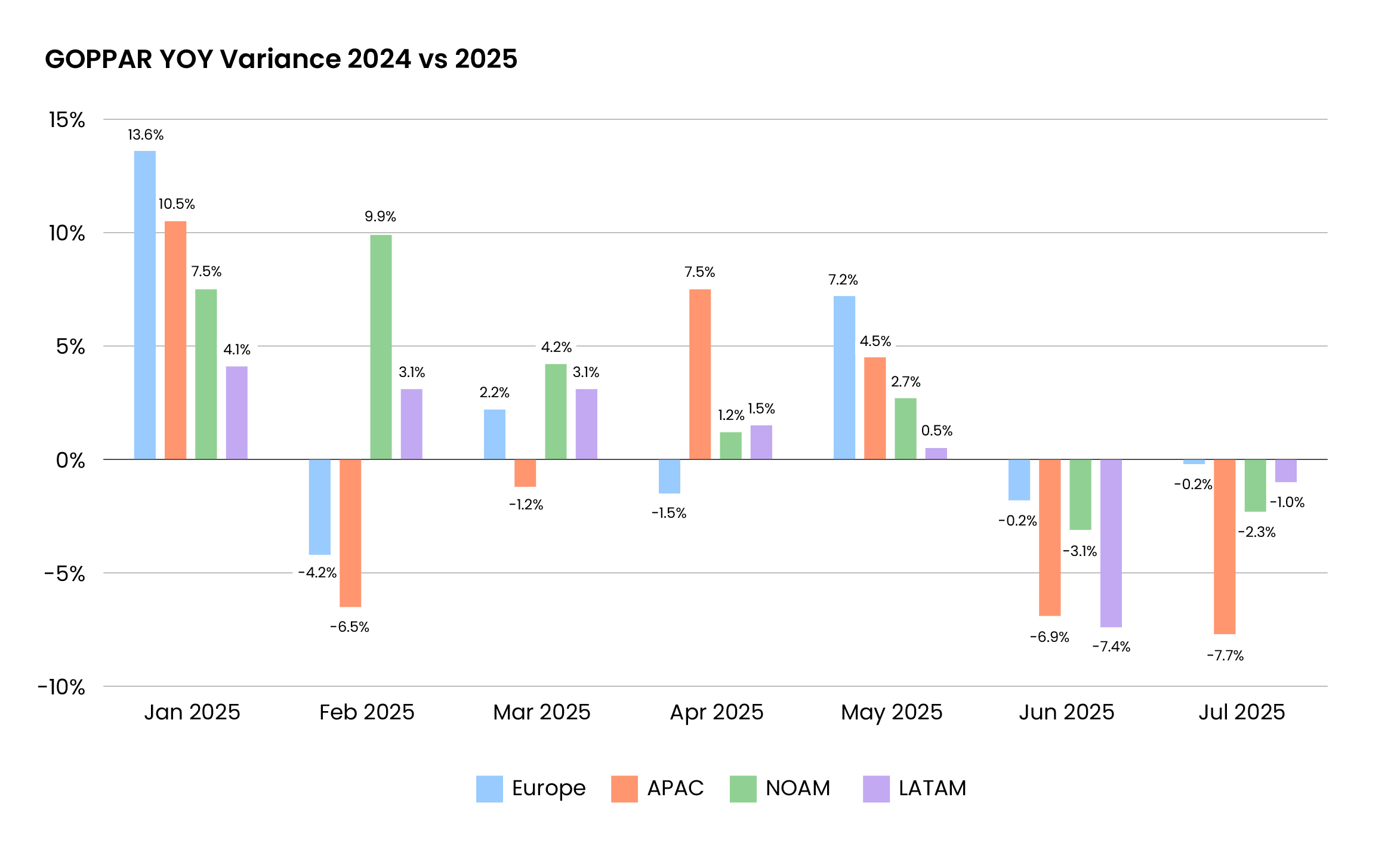 Now that we’ve looked at booking trends, what about the bottom line? The team analyzed financial data from tens of thousands of hotels worldwide over the same period (January–July 2025 vs. 2024).