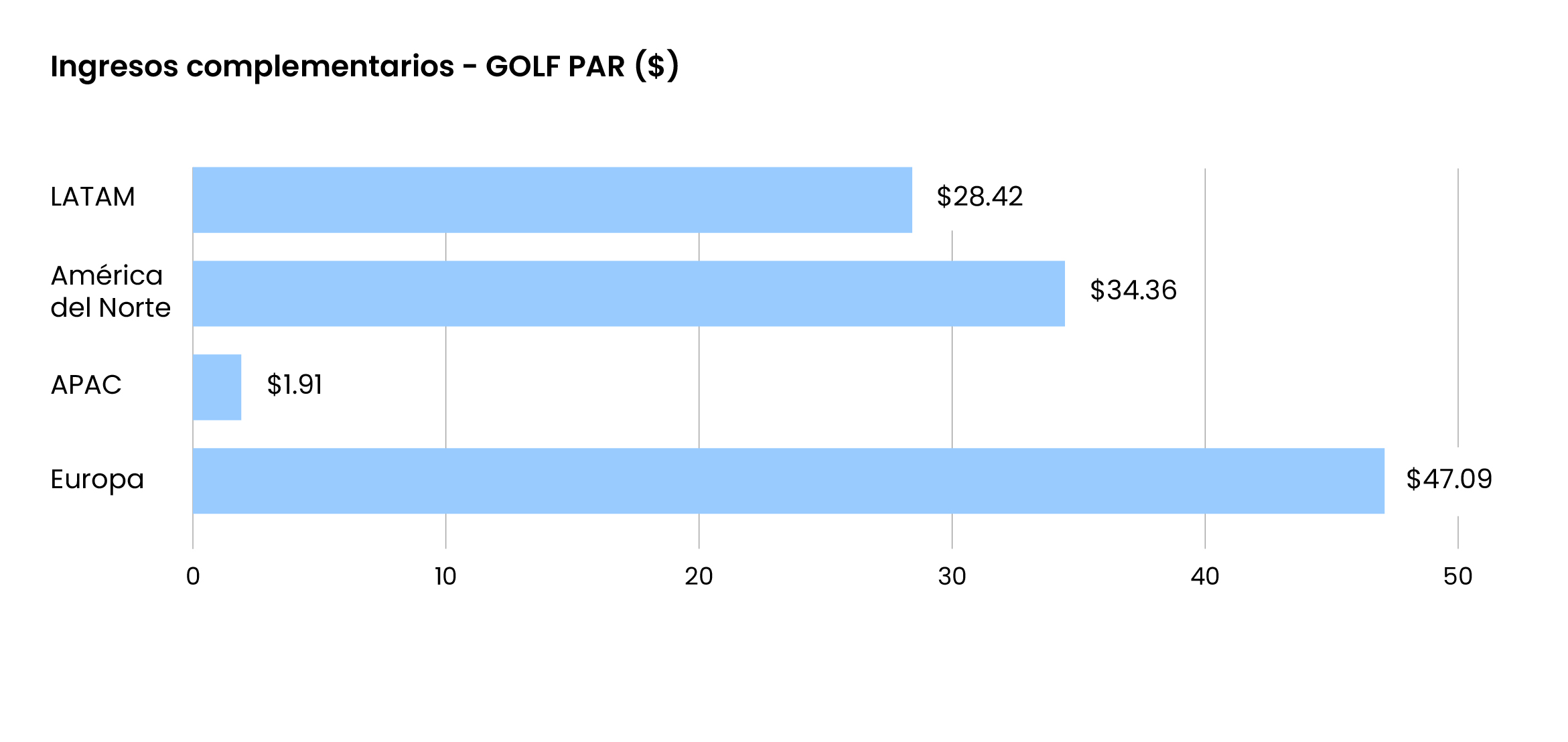 Golf PAR. En el caso de los resorts, el golf sigue siendo una importante fuente de ingresos. Europa lideró la clasificación (47,09 dólares), seguida de Norteamérica (34,46 $) y Latinoamérica (28,42 $). En Asia-Pacífico, los ingresos por golf fueron mínimos, con 1,91 $ por habitación disponible.