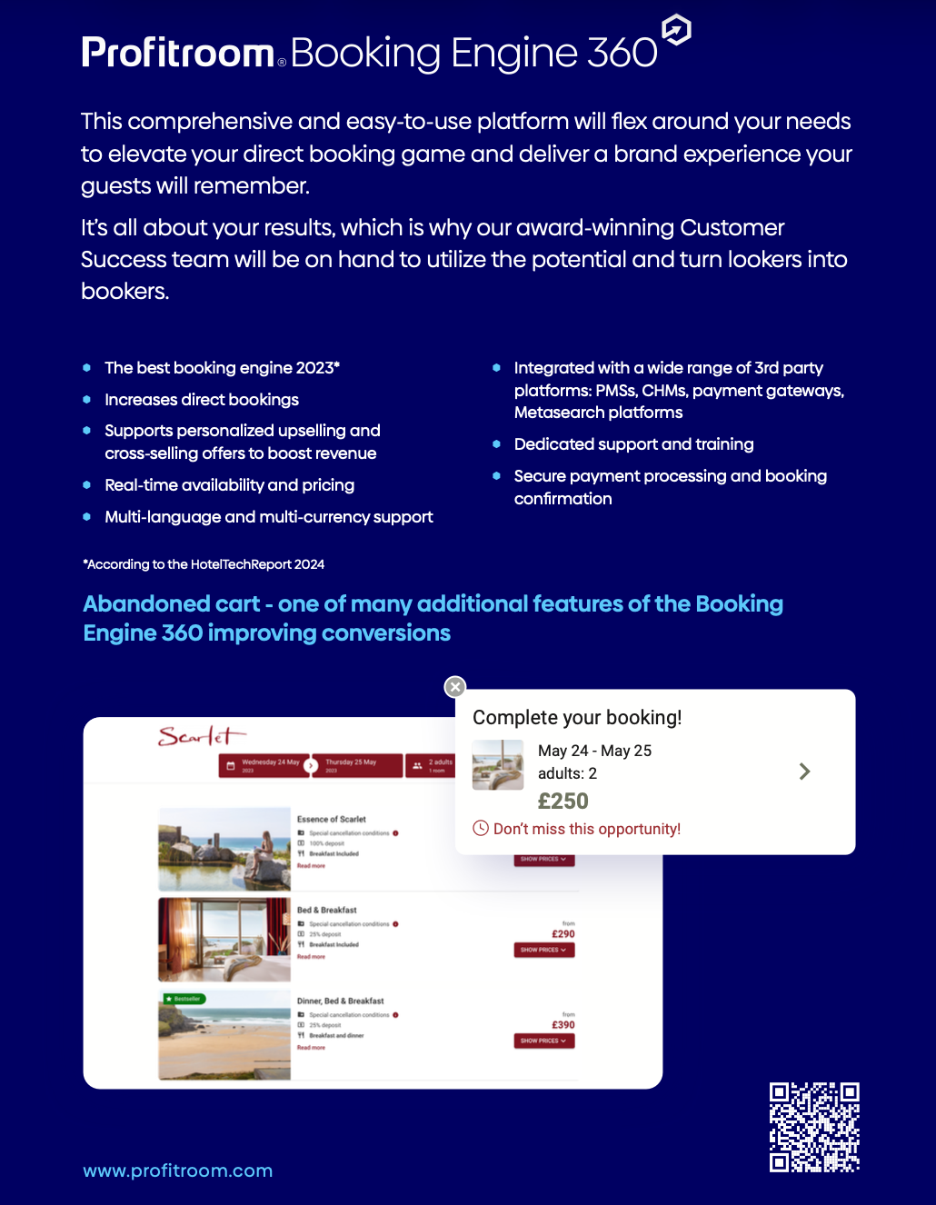 Profitroom ofrece tecnología de reservas galardonada, automatización de marketing y herramientas de experiencia del huésped diseñadas para incrementar tus ingresos directos. Creado para hoteles y resorts que trabajan con Cloudbeds para crecer de manera más inteligente, rápida y rentable.