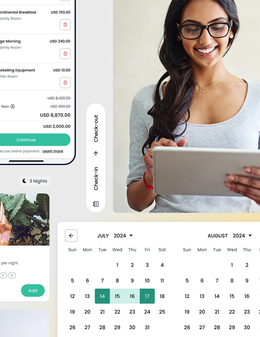 Menos pasos. Más reservas. Ofrece una experiencia integrada y personalizada que mantiene a los huéspedes en tu sitio web con el motor de reservas de Cloudbeds – un proceso fluido y optimizado para dispositivos móviles, diseñado para maximizar las reservas directas.