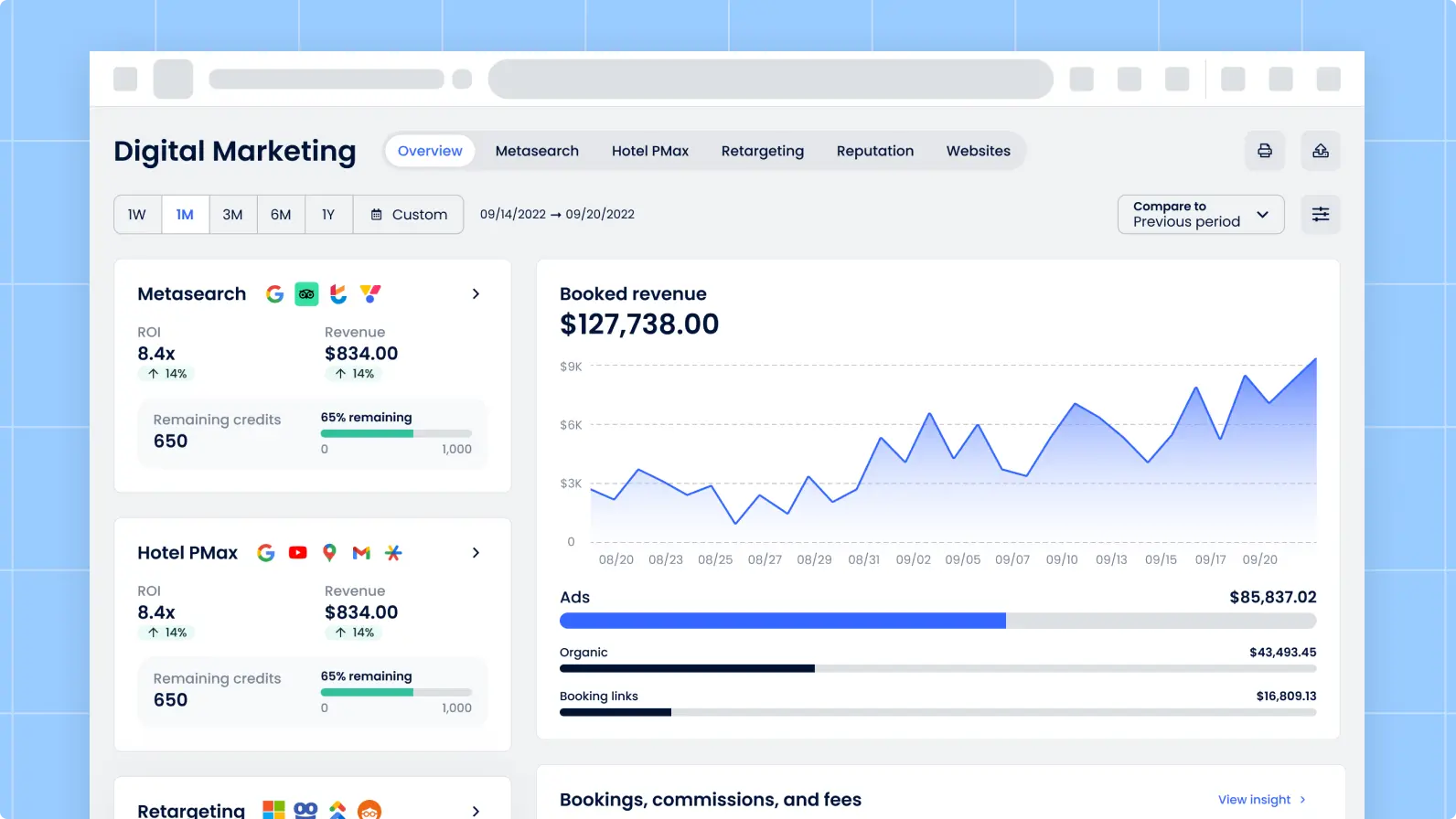 Convierte cada visita en ingresos. Comparador de tarifas, códigos promocionales, paquetes de temporada, ventas adicionales con un solo clic: herramientas inteligentes que funcionan conjuntamente para ayudarte a aumentar las reservas directas en un 25 % y a maximizar cada transacción.