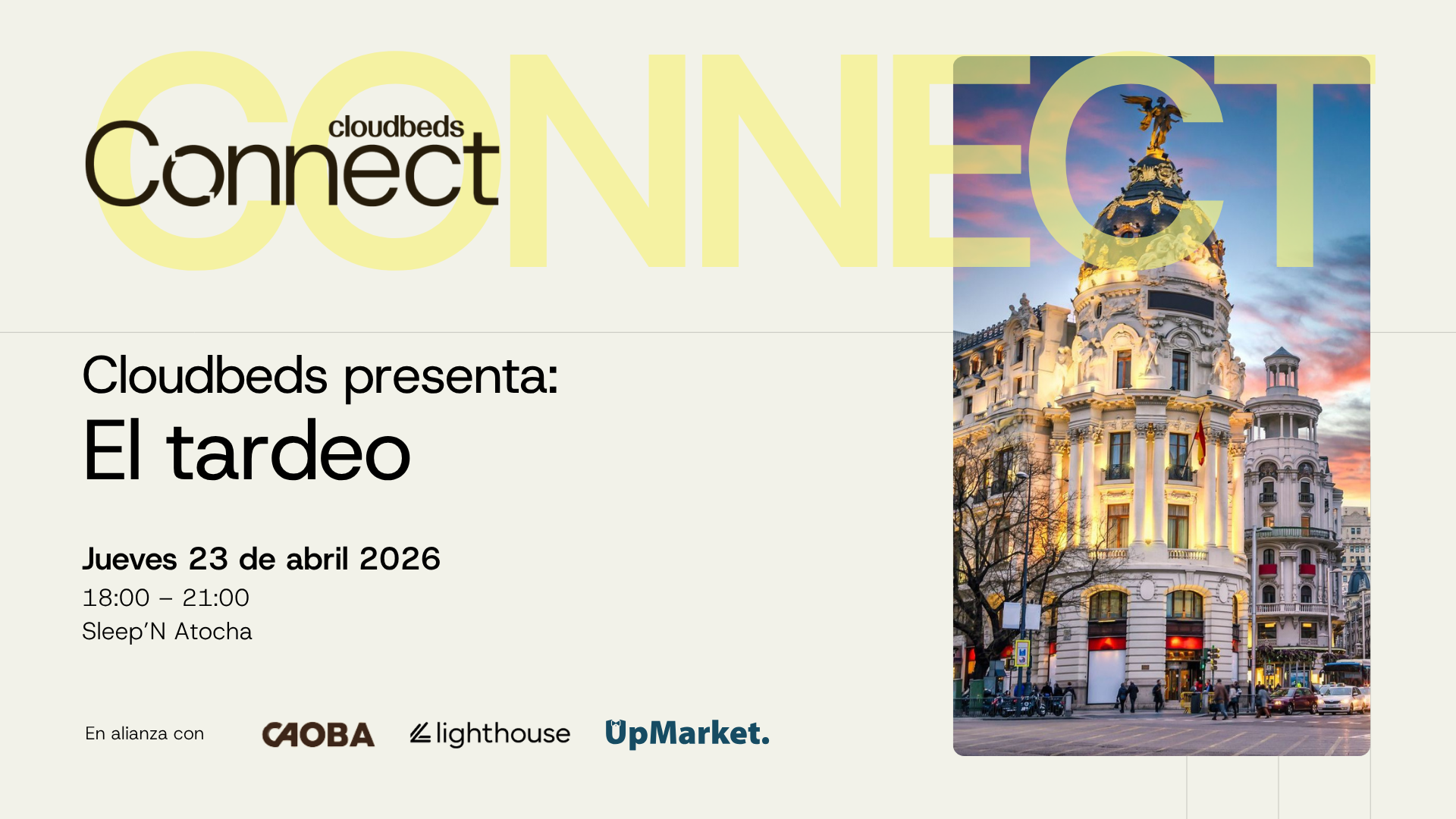Acompaña a Cloudbeds, Caoba Hotels, Lighthouse y UpMarket en un encuentro especial en Madrid.
