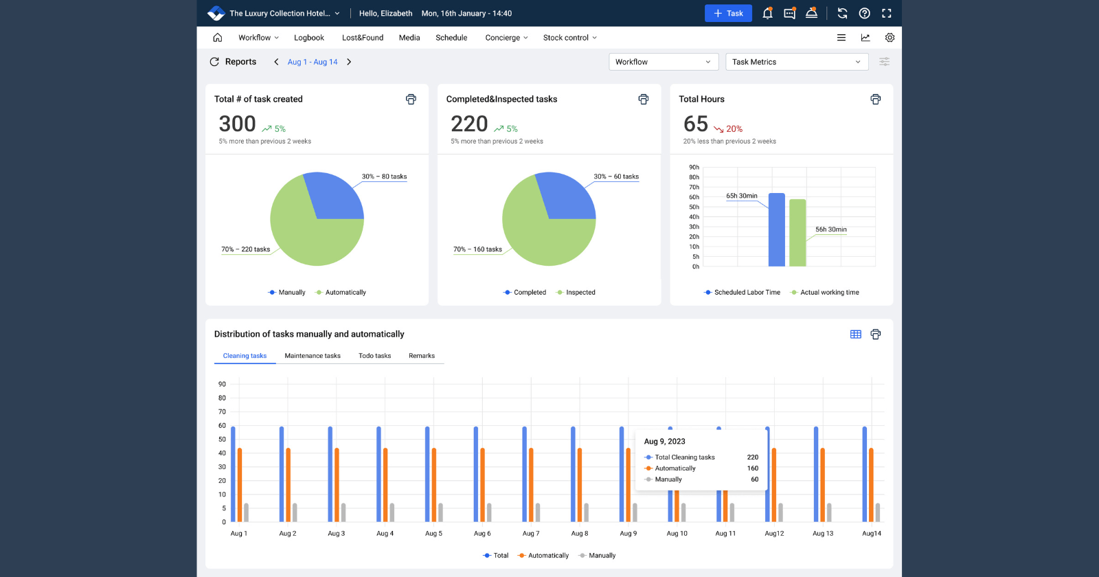 Gain a managerial edge with real-time oversight, on-the-go decision-making, smart scheduling, and reports. Equip staff with tools to control task timing, inspect, add tasks, and chat via mobile app.