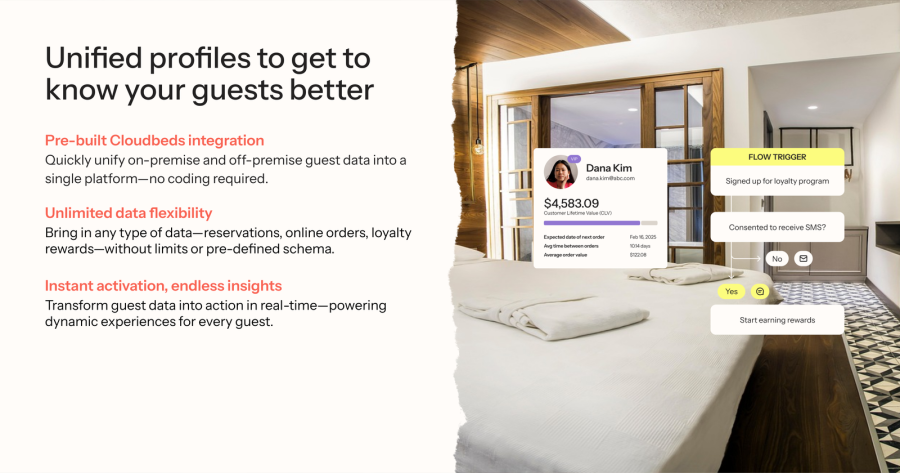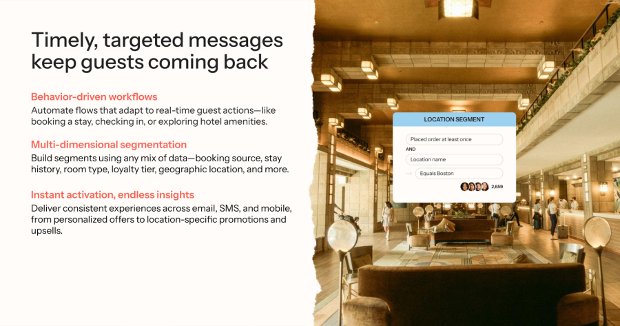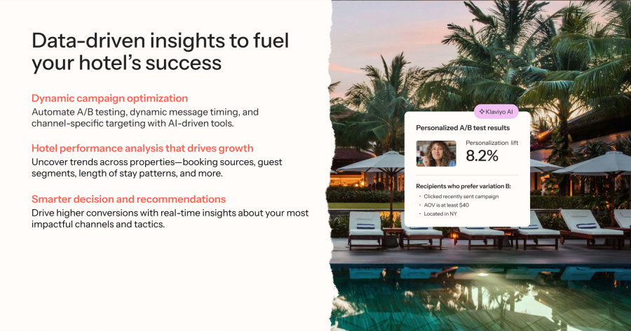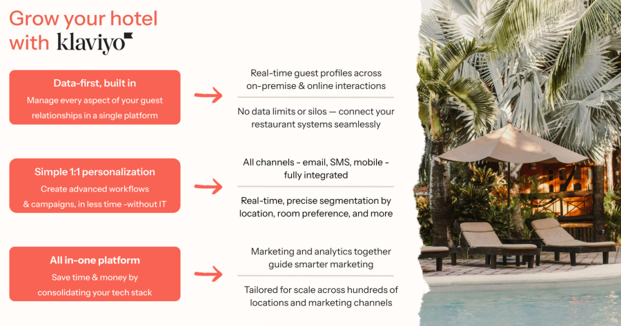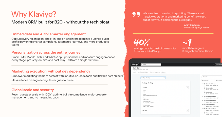 Klaviyo’s CRM puts you even further ahead—unifying real time, first party guest data to power personalized messaging across Email, SMS, WhatsApp and Push—so you drive more direct bookings, upsells, and repeat stays. With AI powered segmentation, predictive analytics and 350+ integrations (like Meta, TikTok, Google, and OpenTable), you’ll deliver personalized experiences at scale.