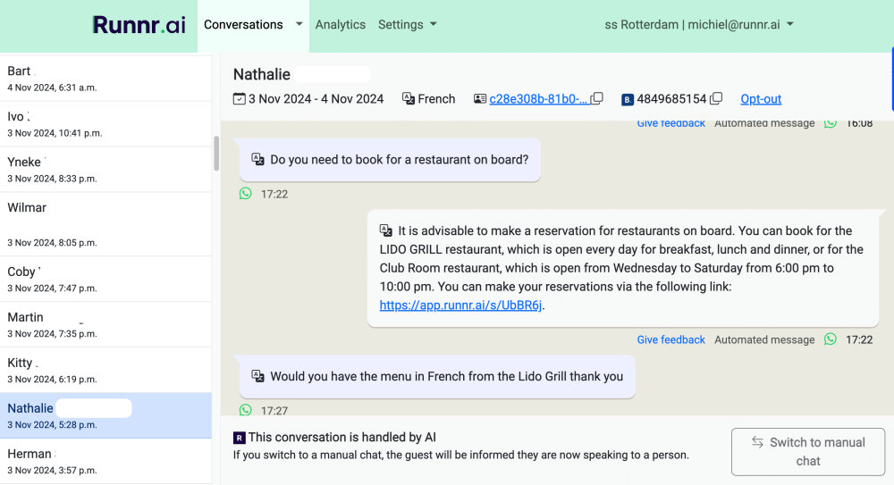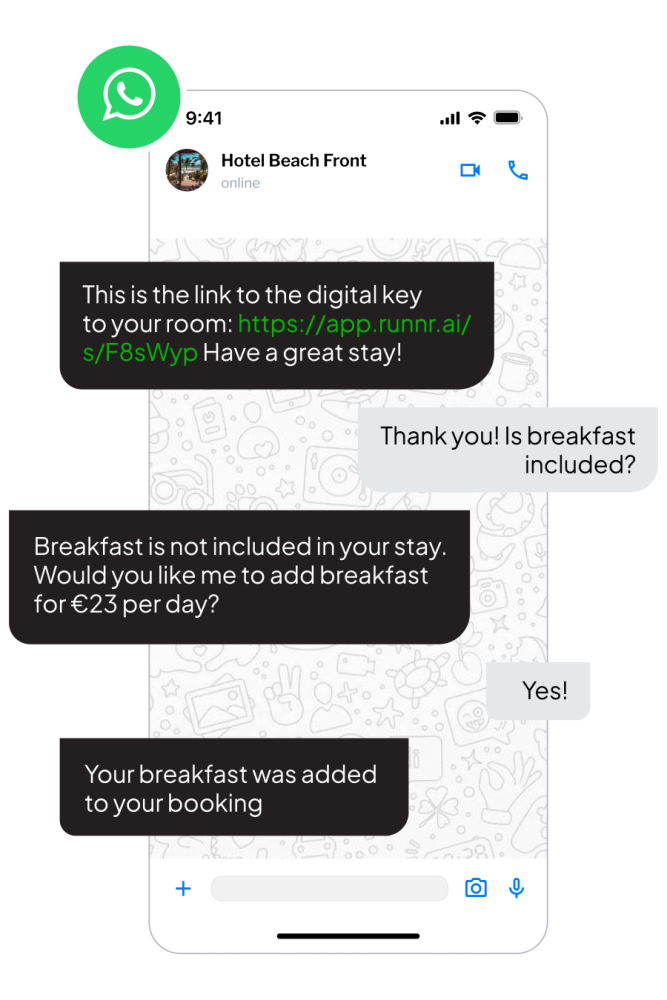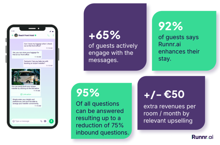 By automating repetitive tasks like handling FAQs and housekeeping requests, Runnr.ai lightens the staff workload, allowing them to focus on more complex and valuable tasks.