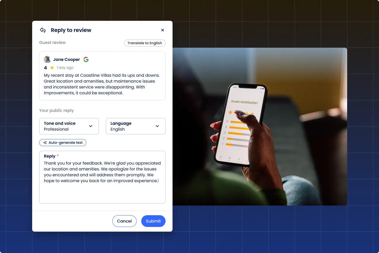 Automatize a análise de sentimento dos hóspedes e responda facilmente a avaliações no Google, Booking e Airbnb com respostas personalizadas em um clique.