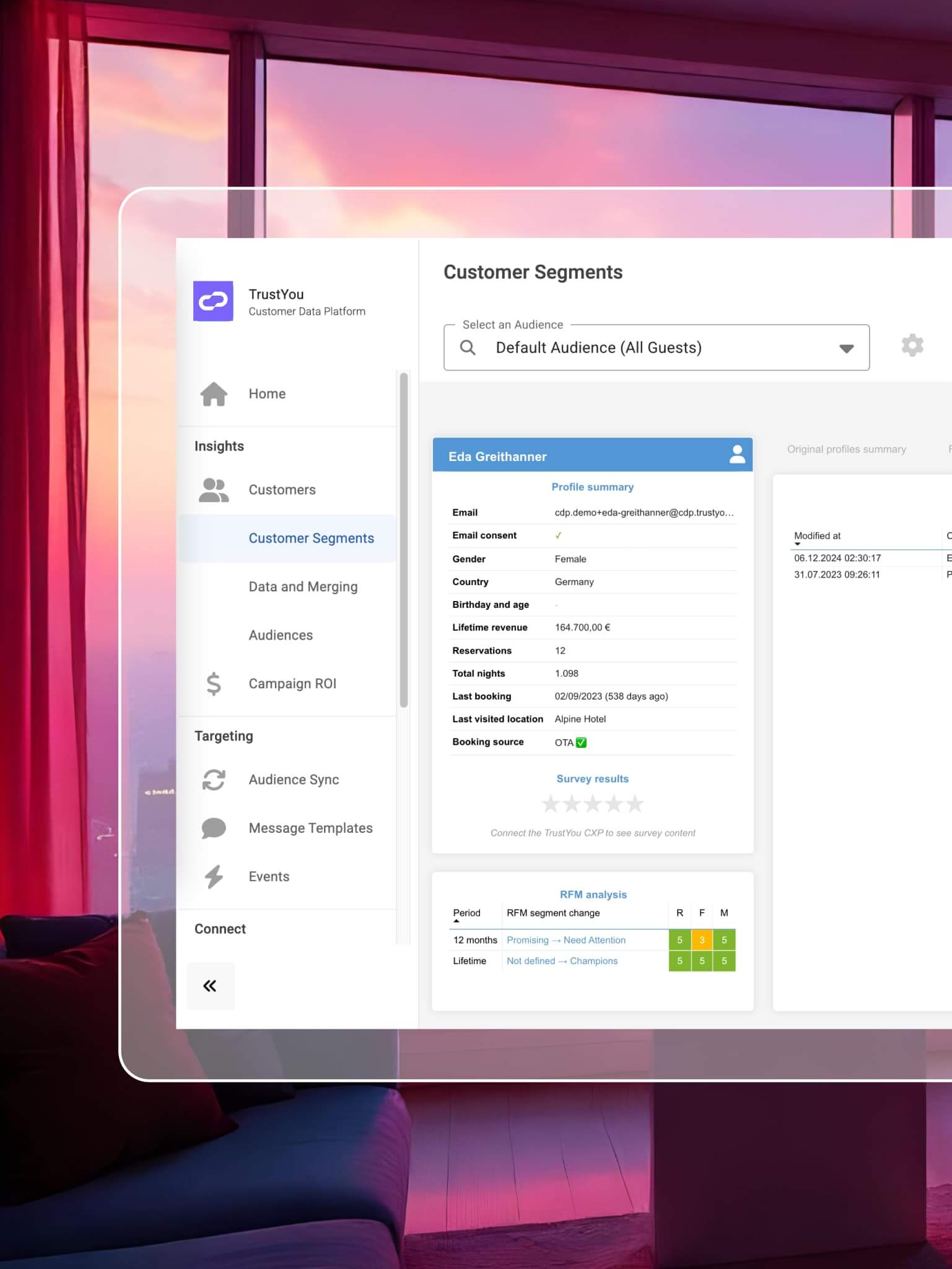• Plataforma de Dados do Cliente (CDP): Gestão de dados de clientes com IA para mais reservas diretas. Una e consolide os dados dos clientes, gere consentimentos e transforme insights em marketing eficaz, jornadas personalizadas e maior valor ao longo da vida.