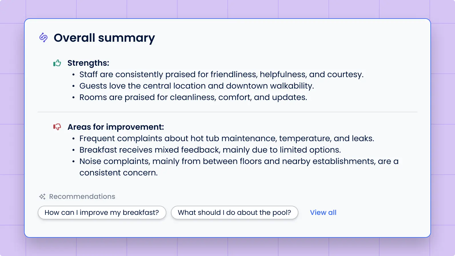• Areas for improvement: what guests are regularly mentioning as negatives.