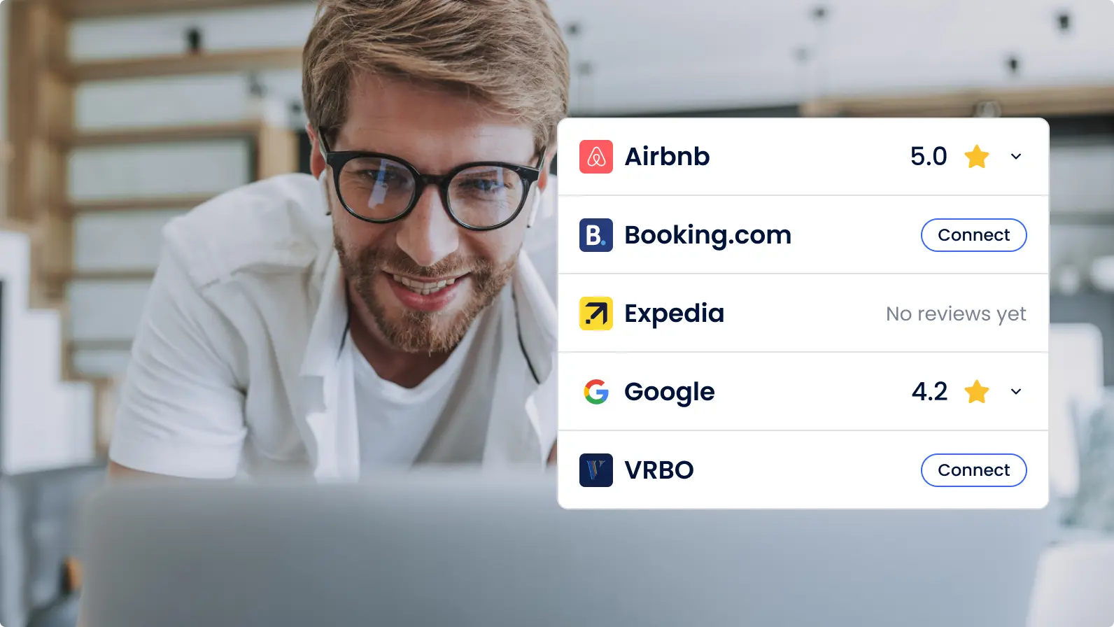 Booking.com, Expedia, Airbnb, Vrbo, Google, and more — all automatically imported into your dashboard.